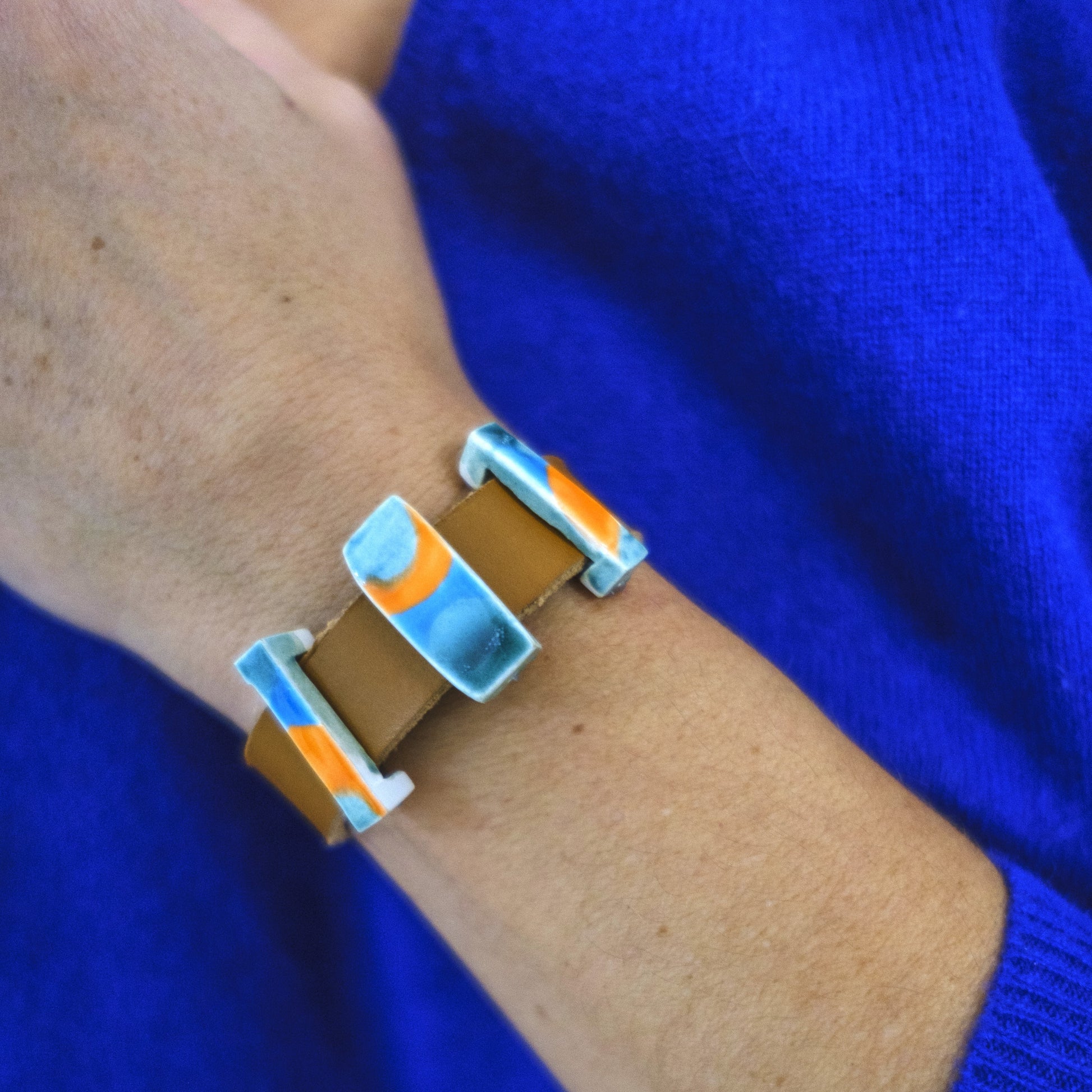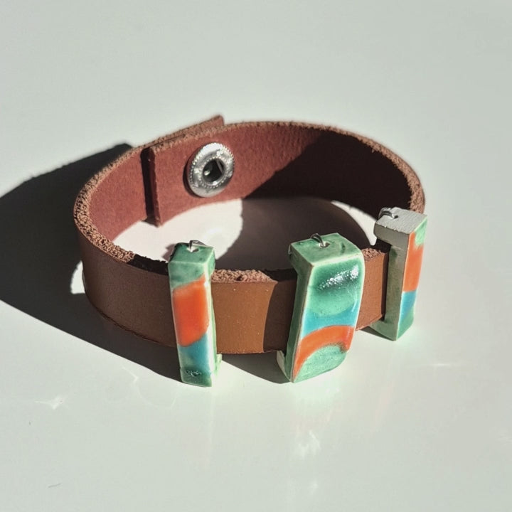 premium genuine leather | hand cast glazed ceramic | closure: high-durability stainless steel pressure-button | hand-finished with attention to unique glaze variations.