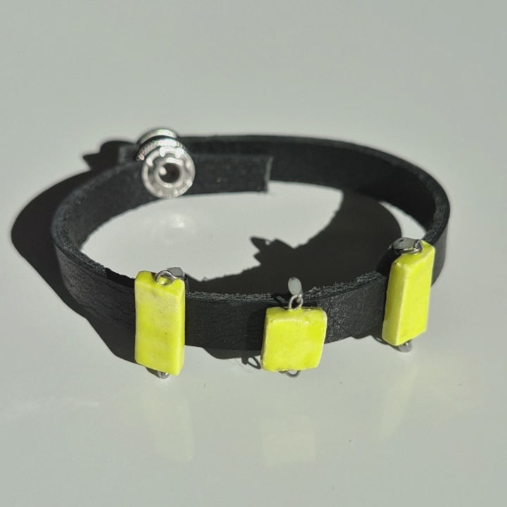 premium genuine leather | hand cast glazed ceramic | closure: high-durability stainless steel pressure-button | hand-finished with attention to unique glaze variations.