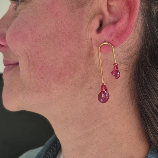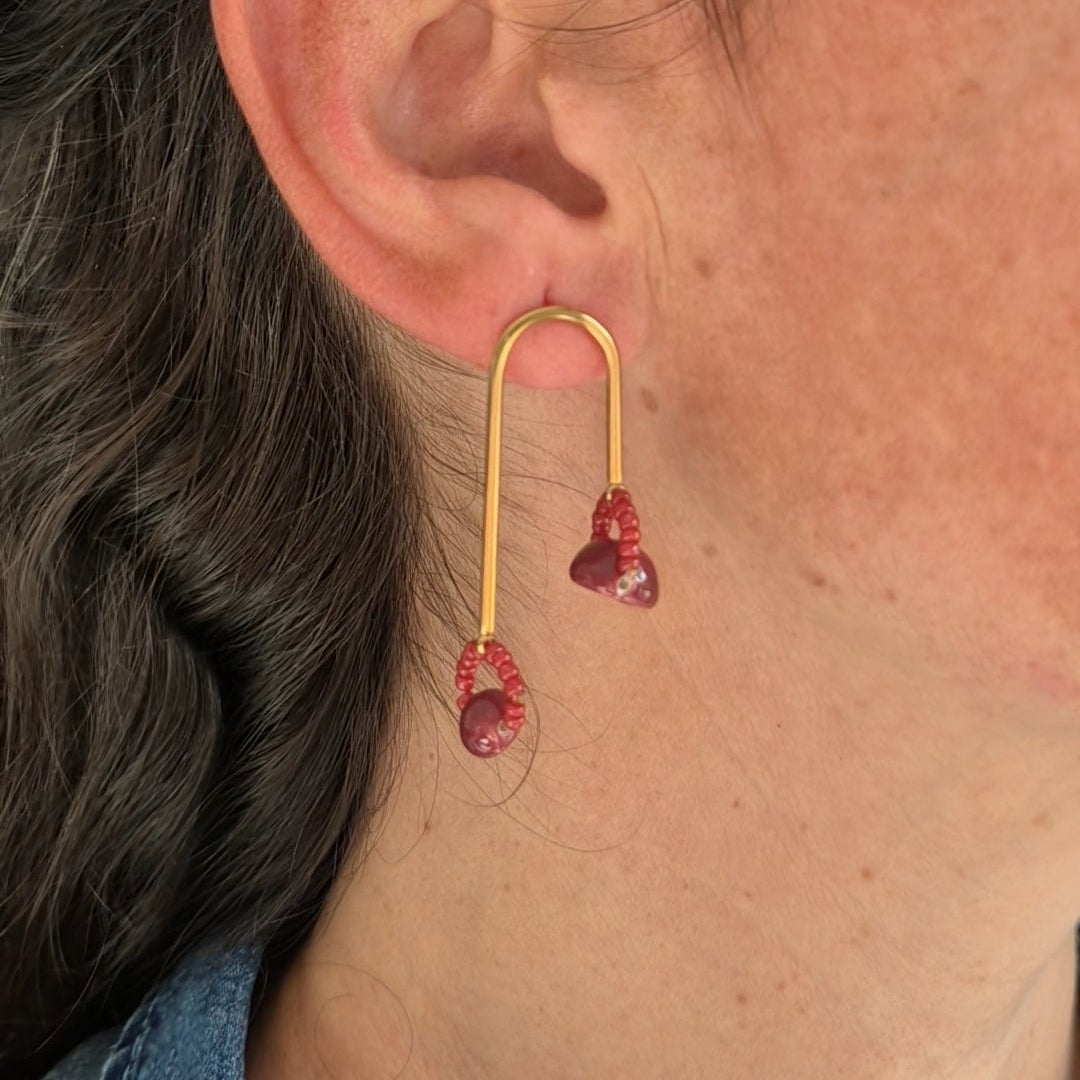 A masterful blend of engineering and elegance. Vibrant red beads are meticulously arranged along a structural gold U-frame, creating a rhythmic, tactile finish.