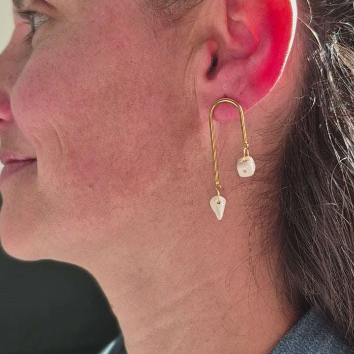 The Design: Golden U-frames adorned with asymmetrical white geometric charms. The play between the sharp angles of the charms and the soft curve of the metal creates a perfect visual tension.